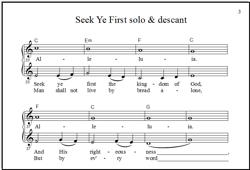 This duet arrangement with the descant of Seek Ye First is easy, and very pretty.