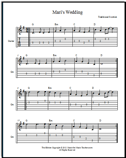 Now here is a version of Mari's Wedding with standard notation plus guitar tabs: