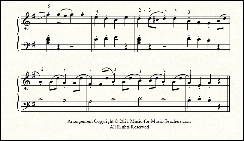 Though the fingering I have placed is sensible, I found I couldn't get the speed I wanted when using finger 5 at the top of the little runs that begin measures one and nine. Instead, I ended up using 1-2-3-4! to put energy into the first measure. Your students will have to experiment.