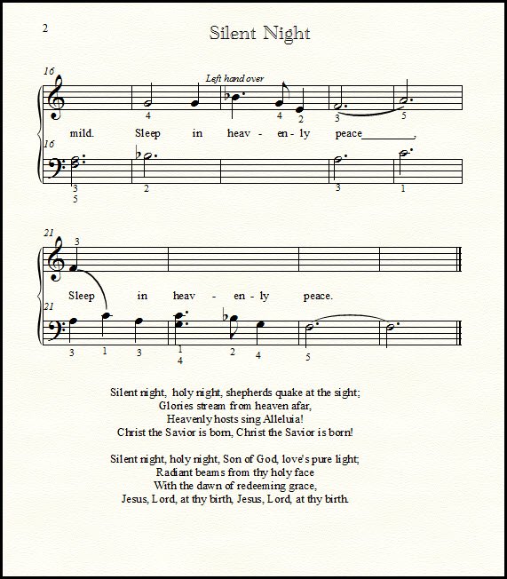 Silent Night is a difficult melody with a range greater than the ten fingers, and piano books tend to have younger students cross the left hand over the right hand in order to achieve that highest note of the melody!